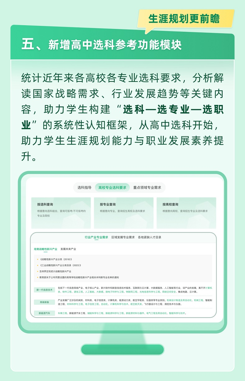 統(tǒng)計(jì)近年來各高校各專業(yè)選科要求,分析解讀國家戰(zhàn)略需求、行業(yè)發(fā)展趨勢等關(guān)鍵內(nèi)容,助力學(xué)生構(gòu)建“選科—選專業(yè)—選職業(yè)”的系統(tǒng)性認(rèn)知框架,從高中選科開始,助力學(xué)生生涯規(guī)劃能力與職業(yè)發(fā)展素養(yǎng)提升。