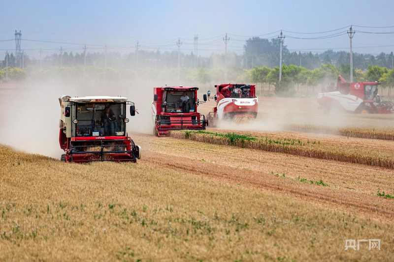 種糧大戶張洪文的4臺(tái)聯(lián)合收割機(jī)開足馬力馳騁在麥田里(央廣網(wǎng)發(fā) 王建安 攝)