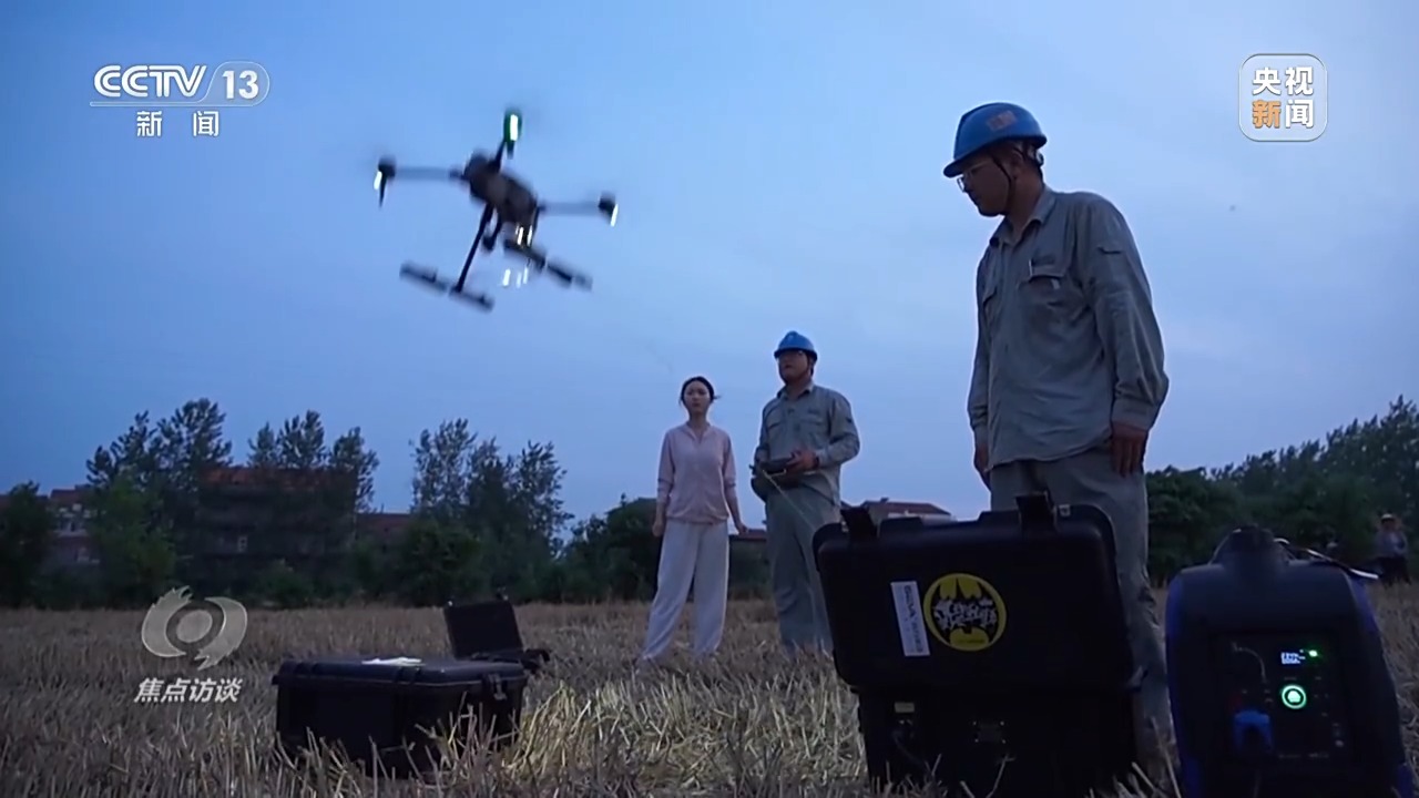 像放風(fēng)箏一樣,一個人從供電機牽線,另一個人控制無人機飛行,兩人打好配合,燈隨著車走。經(jīng)過五次磨合試飛,600瓦的燈光終于刺破夜空,照亮了兩畝麥田的區(qū)域。供電所技術(shù)人員的駐守,讓吳從先家的小麥在暴雨來臨前全部入倉。