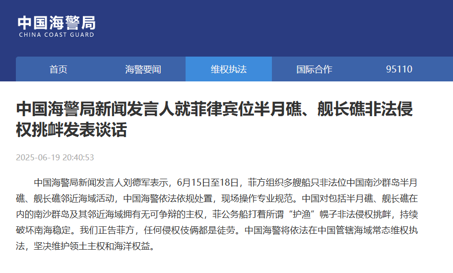 中國(guó)海警局新聞發(fā)言人劉德軍表示,6月15日至18日,菲方組織多艘船只非法位中國(guó)南沙群島半月礁、艦長(zhǎng)礁鄰近海域活動(dòng),中國(guó)海警依法依規(guī)處置,現(xiàn)場(chǎng)操作專(zhuān)業(yè)規(guī)范。中國(guó)對(duì)包括半月礁、艦長(zhǎng)礁在內(nèi)的南沙群島及其鄰近海域擁有無(wú)可爭(zhēng)辯的主權(quán),菲公務(wù)船打著所謂“護(hù)漁”幌子非法侵權(quán)挑釁,持續(xù)破壞南海穩(wěn)定。我們正告菲方,任何侵權(quán)伎倆都是徒勞。中國(guó)海警將依法在中國(guó)管轄海域常態(tài)維權(quán)執(zhí)法,堅(jiān)決維護(hù)領(lǐng)土主權(quán)和海洋權(quán)益。
