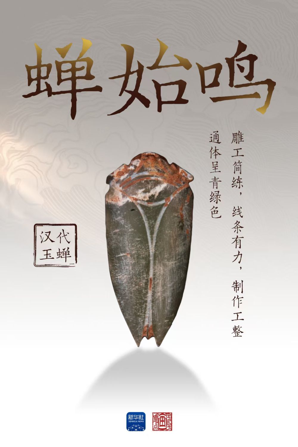 這件漢代玉蟬通體呈青綠色,盛夏的氣息撲面而來(lái)。《禮記·月令》記載:“仲夏之月,蟬始鳴”,古人發(fā)現(xiàn)夏至之日陽(yáng)氣達(dá)到極盛,蟄伏地底多年的蟬若蟲(chóng)會(huì)破土羽化宣告盛夏來(lái)臨,這是自然界的昆蟲(chóng)“節(jié)氣預(yù)報(bào)”。