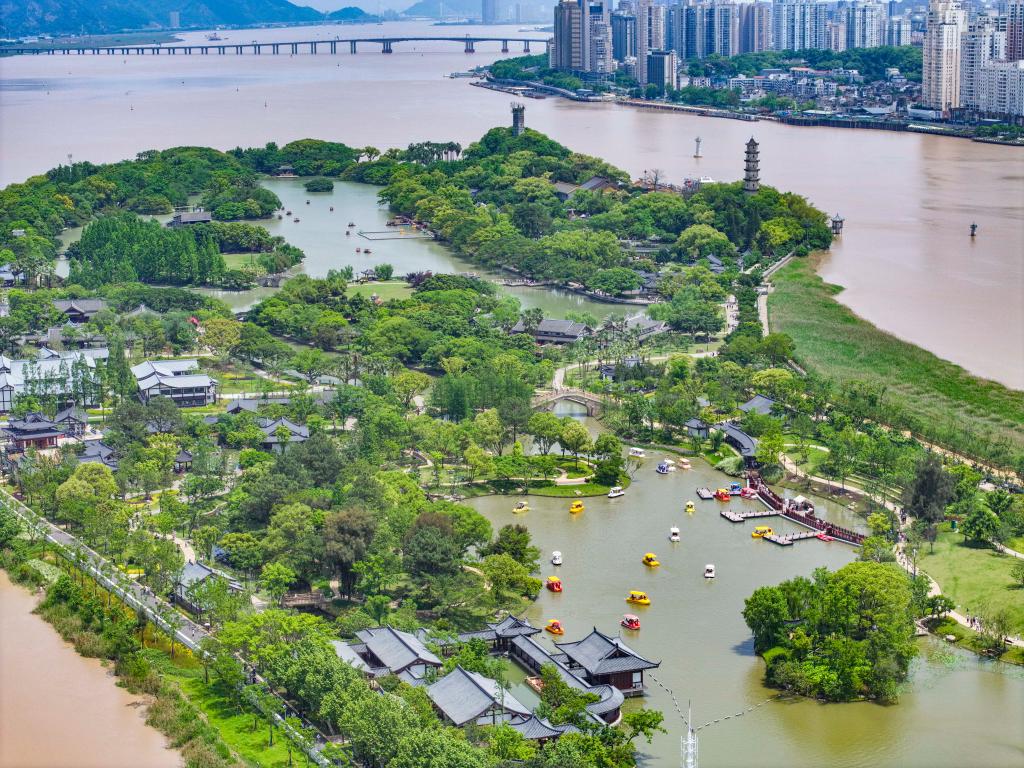 浙江省溫州市鹿城區(qū)江心嶼景區(qū)(無人機(jī)照片,2025年5月1日攝)。新華社發(fā)(蘇巧將攝)