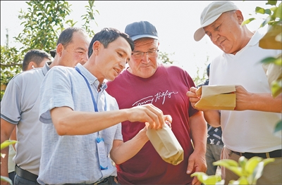 近日,2025年首期中國—中亞五國職業(yè)農(nóng)民培訓(xùn)班在陜西渭南開班。圖為學(xué)員們?cè)谖鞅鞭r(nóng)林科技大學(xué)蘋果試驗(yàn)站了解蘋果套袋知識(shí)。