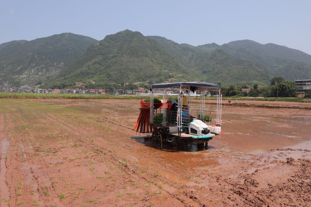 6月13日,在湖南省湘西土家族苗族自治州龍山縣召市鎮(zhèn)前衛(wèi)村,農(nóng)機(jī)手駕駛插秧機(jī)進(jìn)行插秧。新華社發(fā)(曾祥輝 攝)