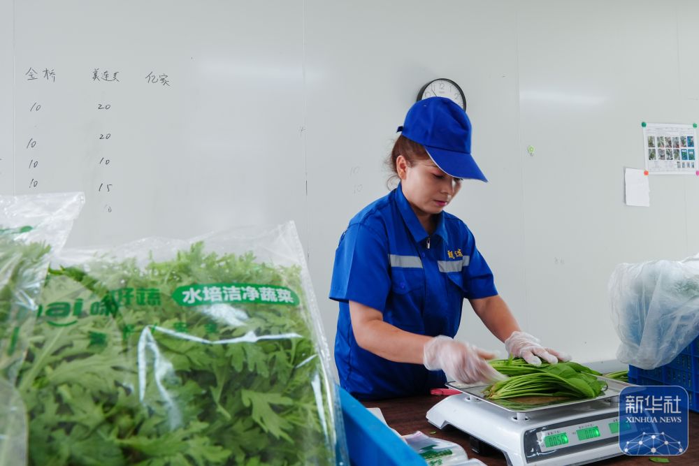 ↑ 6月25日,在新疆阿克蘇地區(qū)庫車市甬庫同心村智慧農(nóng)業(yè)植物工廠,工作人員對(duì)收獲的農(nóng)作物進(jìn)行稱重打包。