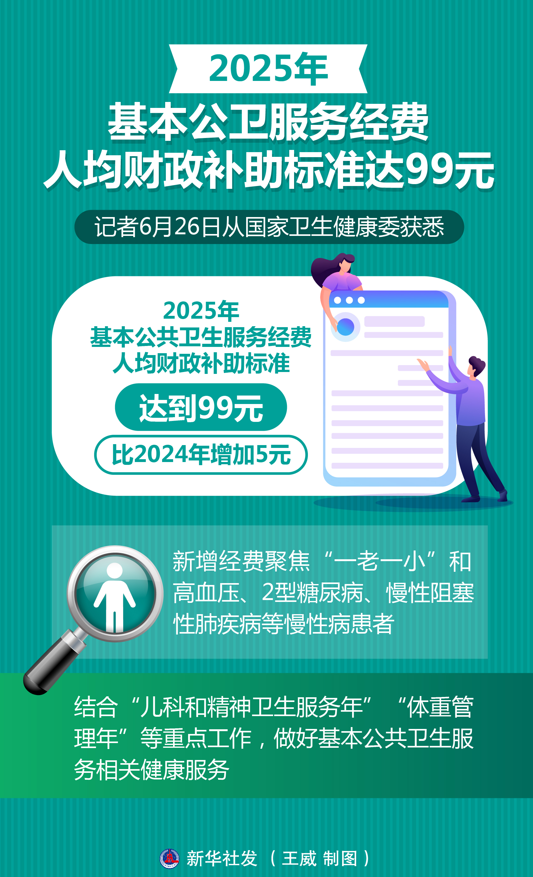 記者26日從國(guó)家衛(wèi)生健康委獲悉,2025年基本公共衛(wèi)生服務(wù)經(jīng)費(fèi)人均財(cái)政補(bǔ)助標(biāo)準(zhǔn)達(dá)到99元,比上年增加5元。