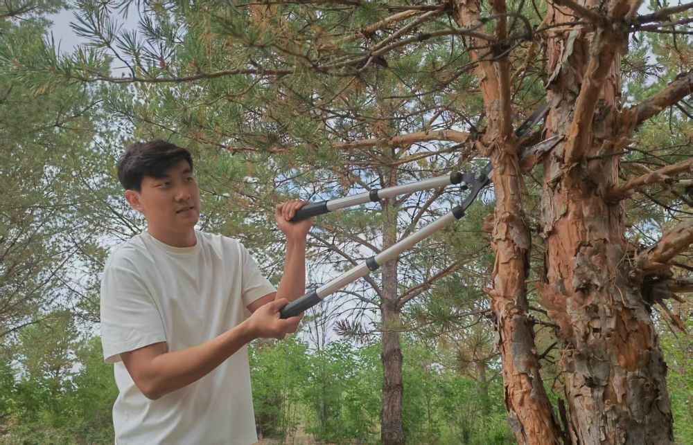 2017年,在爺爺?shù)膸ьI(lǐng)下,石健陽(yáng)正式投身植綠事業(yè)。“過(guò)去沙害嚴(yán)重,老一輩治沙人最迫切的是要定住風(fēng)沙,讓地面先綠起來(lái),所以當(dāng)時(shí)的樹(shù)種主要是生長(zhǎng)快的楊樹(shù)?!笔£?yáng)說(shuō),“幾十年過(guò)去,楊樹(shù)林老化嚴(yán)重,出現(xiàn)大面積枯死的情況。我們現(xiàn)在陸續(xù)對(duì)老化的林地進(jìn)行樹(shù)種更換,補(bǔ)種四季常青、生命周期更長(zhǎng)的樟子松,目前已經(jīng)補(bǔ)種了5萬(wàn)畝?!?/p>