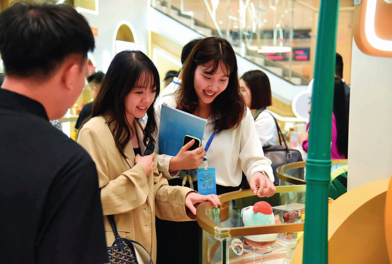港澳青年在橫琴政務(wù)服務(wù)中心的“澳品薈”橫琴展示區(qū)瀏覽澳門創(chuàng)意產(chǎn)品(2024年9月23日攝)洪澤華攝/本刊