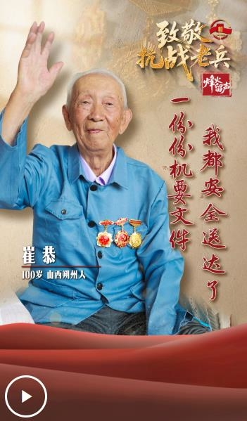 崔恭,100歲,1925年出生在山西平魯縣(今山西朔州市平魯區(qū))一個(gè)貧農(nóng)家庭。1942年參加八路軍,隸屬于晉綏分區(qū)新兵連,一個(gè)月后被選拔到雁北支隊(duì)通信排任通信員。1943年,雁北支隊(duì)撤銷(xiāo)后,歸屬晉綏軍區(qū)塞北軍分區(qū)警衛(wèi)連通信排,任機(jī)要通信員。1946年參加了解放朔縣城的戰(zhàn)斗。