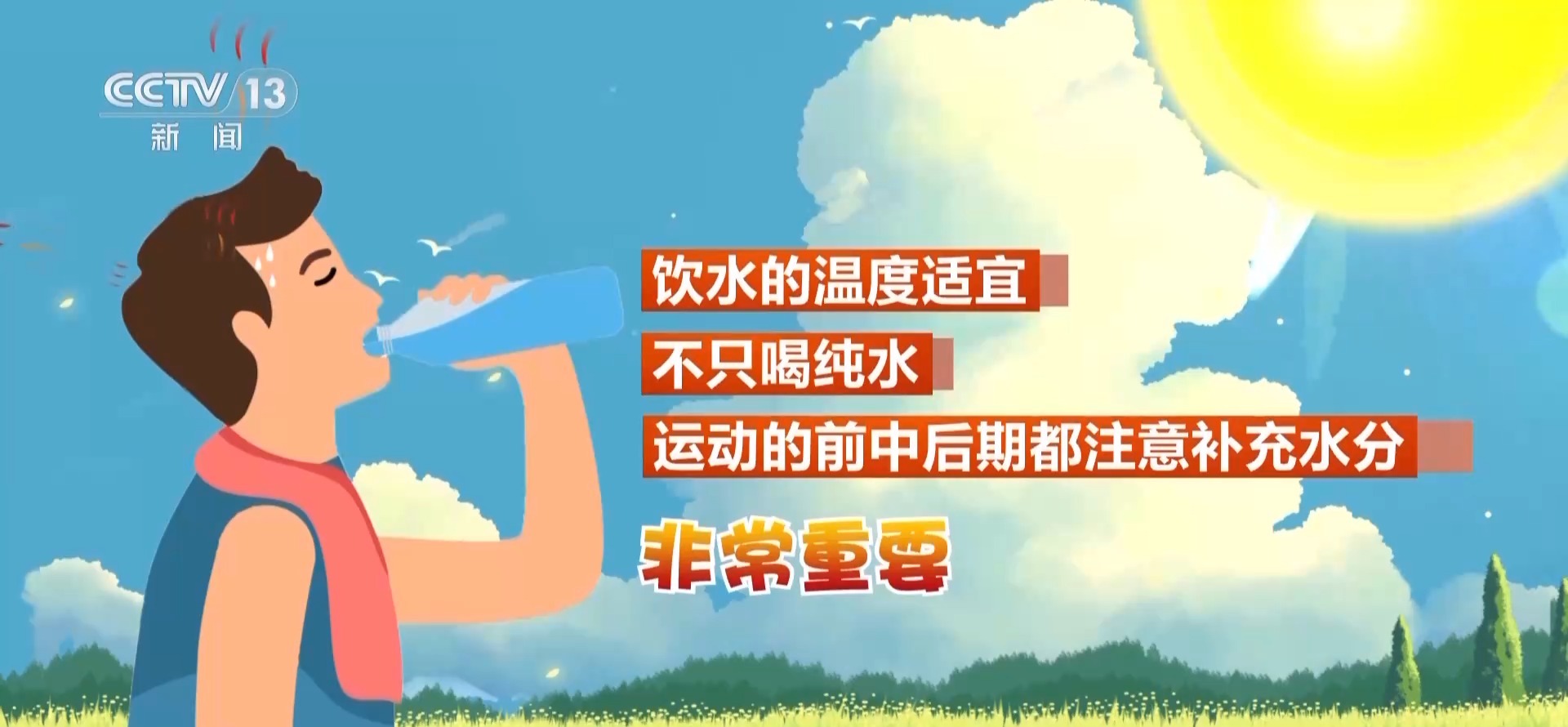 國家體育總局體育科學(xué)研究所運動康復(fù)研究中心研究員 張漓:高溫天氣下最重要的就是補水。高溫天氣下運動,體溫比較難降下來,身體會出汗,幫我們降溫。