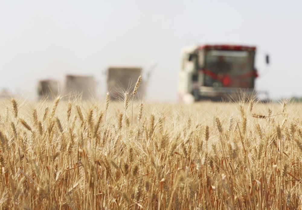 6月10日,河北省石家莊市欒城區(qū)柳林屯鄉(xiāng)東牛村村民駕駛農(nóng)機(jī)收割小麥。新華社發(fā)(梁子棟攝)