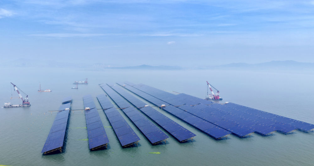 青島市即墨區(qū)鰲山灣海域的海上光伏項目區(qū)(7月3日攝,無人機(jī)照片)。新華社記者李紫恒攝