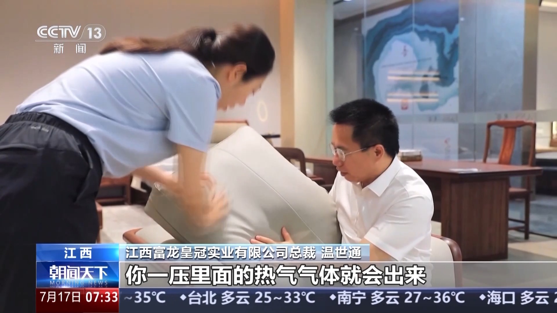 江西富龍皇冠實(shí)業(yè)有限公司總裁 溫世通:沙發(fā)靠墊后面我們?nèi)看蛄送笟饪?,一壓里面的熱氣氣體就會(huì)出來(lái),保證背部不會(huì)有很熱很燙的感覺(jué),在銷(xiāo)售方面保持增長(zhǎng)。