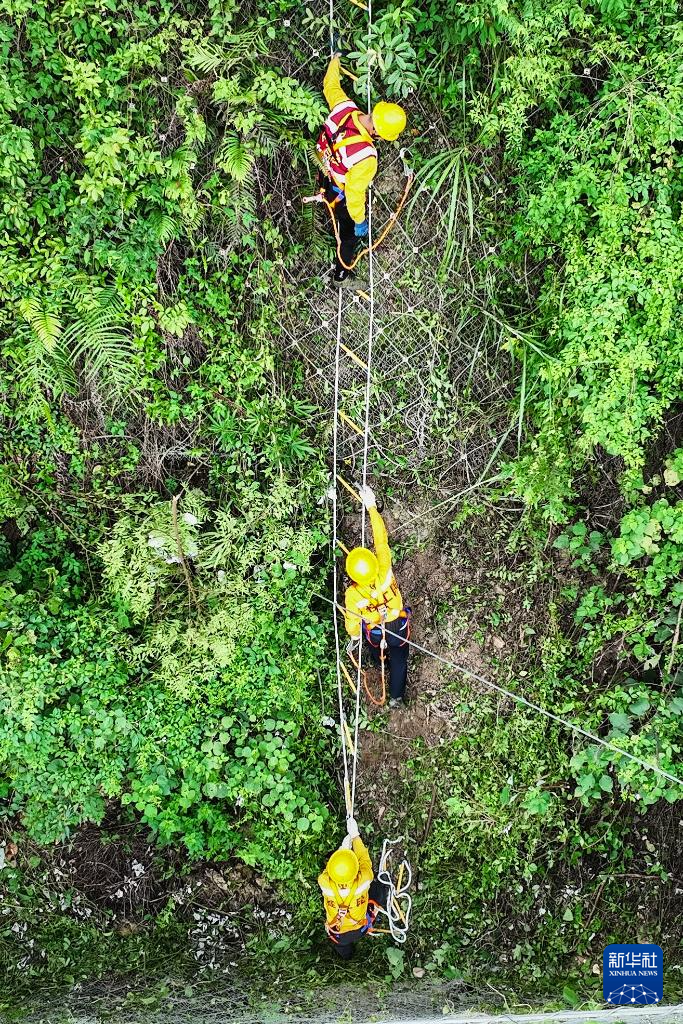 橋隧工人巡查隧道頂部的被動網(7月15日攝,無人機照片)。