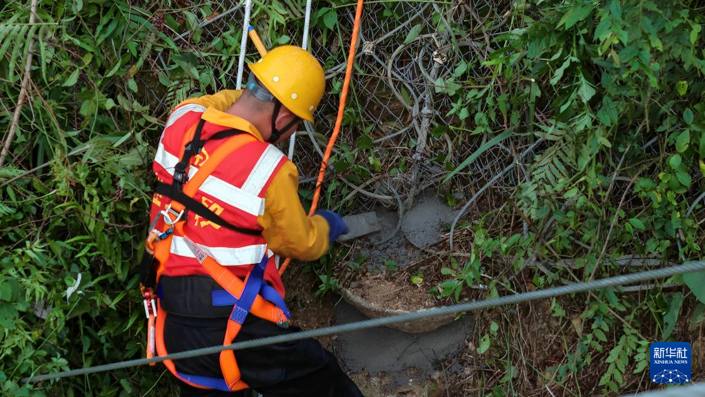 橋隧工人清除被動網上的藤蔓和雜草(7月15日攝,無人機照片)。
