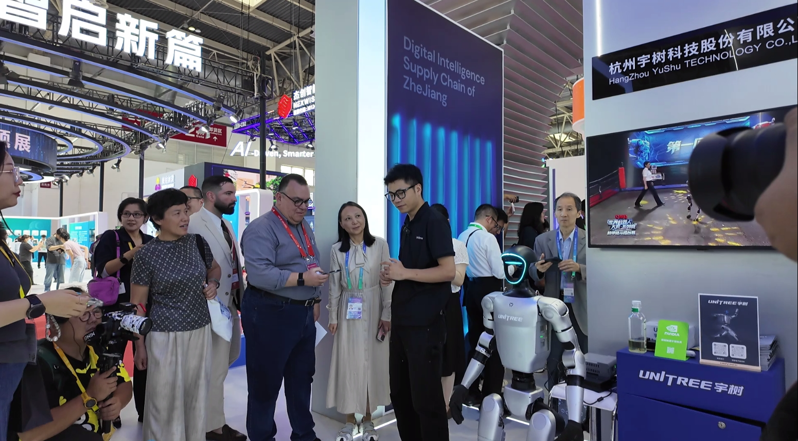 在第三屆鏈博會(huì)上,外國觀眾在浙江專區(qū)向宇樹科技工作人員咨詢。(央廣財(cái)經(jīng)記者黃昂瑾 攝)