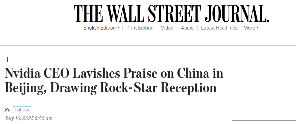 美國(guó)《華爾街日?qǐng)?bào)》報(bào)道稱,市值達(dá)4萬(wàn)億美元的AI芯片公司掌門(mén)人黃仁勛在訪問(wèn)北京期間多次表達(dá)對(duì)中國(guó)的贊賞,盛贊中國(guó)的科技進(jìn)步。
