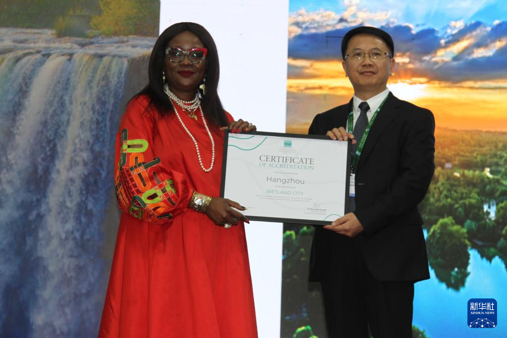 7月24日,在津巴布韋維多利亞瀑布城開幕的《濕地公約》第十五屆締約方大會上,《濕地公約》秘書長穆松達·蒙巴為中國浙江杭州代表頒發(fā)“國際濕地城市”證書。新華社發(fā)(塔法拉攝)