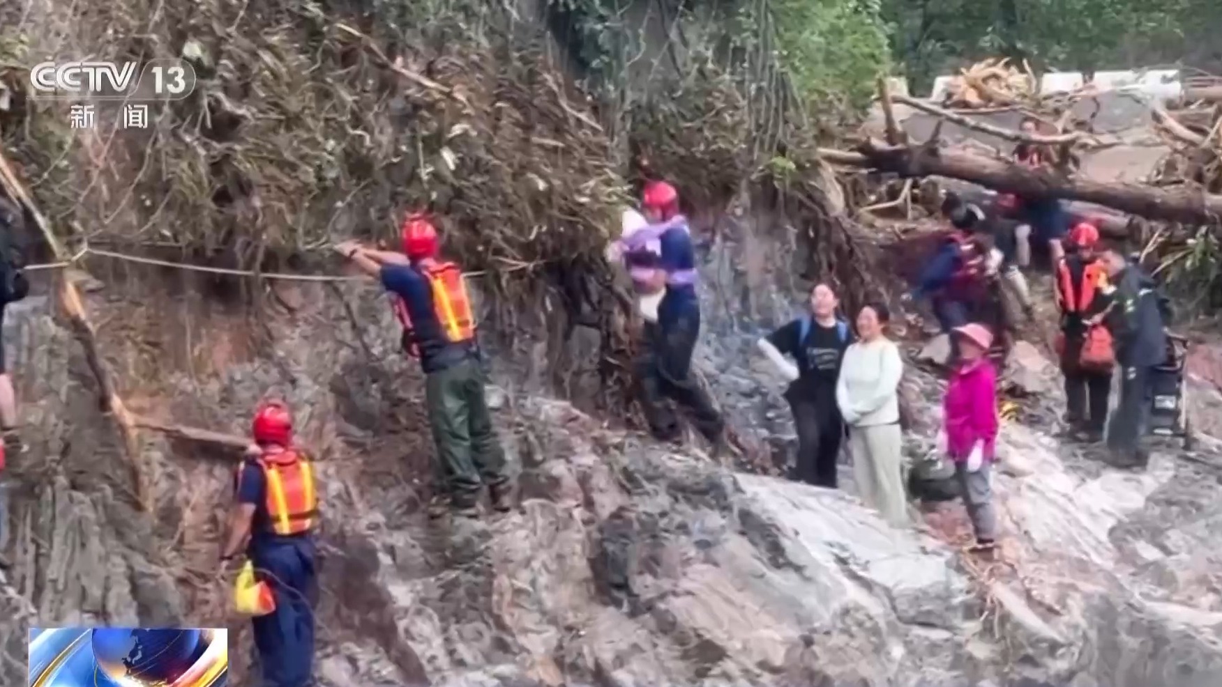 渡過斷橋還有斷路,這段路需要攀崖壁而行,隊員們拉起繩索,有自主行動能力的被困群眾,緊抓繩索,小心沿懸崖邊緣艱難通行;對于行動不便的老人、兒童和傷員,救援人員將他們一個個背負過險段。