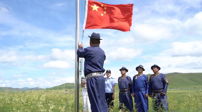 科右前旗守望草原巡防隊(duì)滿族屯分隊(duì)舉行升旗儀式。蔣豪文 攝