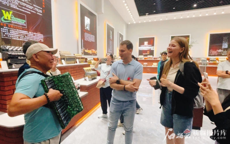 在塔城市民間手風(fēng)琴藝人谷英福的伴奏下,留學(xué)生們聞聲起舞歡唱,《喀秋莎》《莫斯科郊外的晚上》《山楂樹(shù)》等一首首熟悉的旋律響起,前來(lái)參觀的游客們也加入了大合唱,熱鬧的氛圍瞬間拉滿?!斑@里多民族和睦相處,可以感受到音樂(lè)已成為大家交往交流交融的橋梁,呈現(xiàn)出了文化的豐富多樣性,這感覺(jué)很美妙。”來(lái)自俄羅斯的留學(xué)生妮拉有感而發(fā)。
