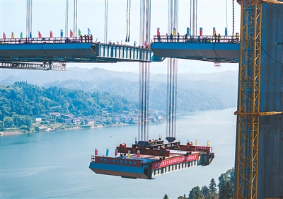 8月3日,由湖南路橋建設(shè)集團(tuán)承建的張官高速控制性工程洞庭溪沅水特大橋主橋順利合龍,為2026年全線通車奠定堅(jiān)實(shí)基礎(chǔ)。張官高速公路北起張家界市永定區(qū),南至懷化市沅陵縣官莊鎮(zhèn),是國(guó)家高速公路網(wǎng)呼和浩特—北海高速公路的重要組成部分。圖為大橋施工現(xiàn)場(chǎng),一塊鋼混結(jié)合梁在被緩緩提升。新華社記者 陳思汗攝