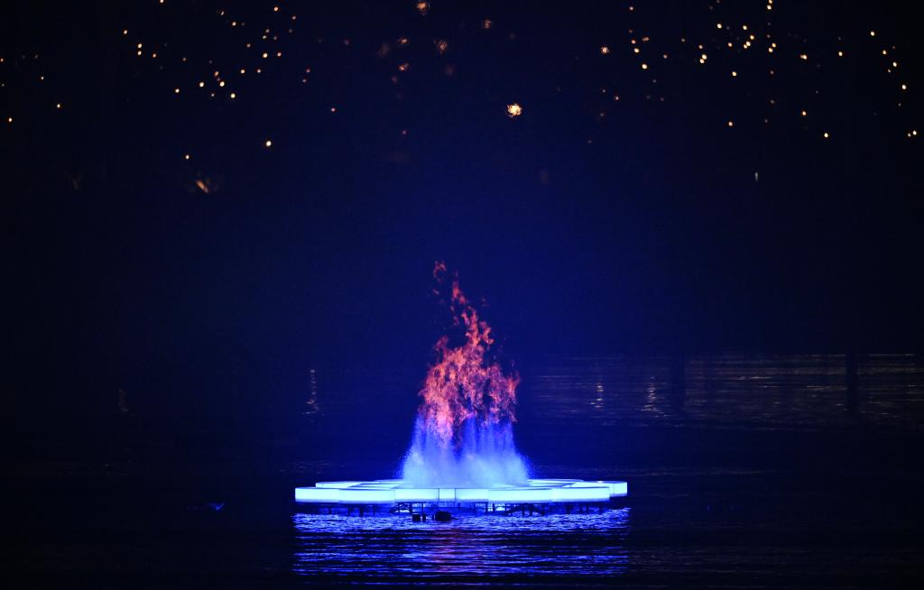 摩托艇靠近,點(diǎn)火——噴泉頂端,圣火熊熊燃起。