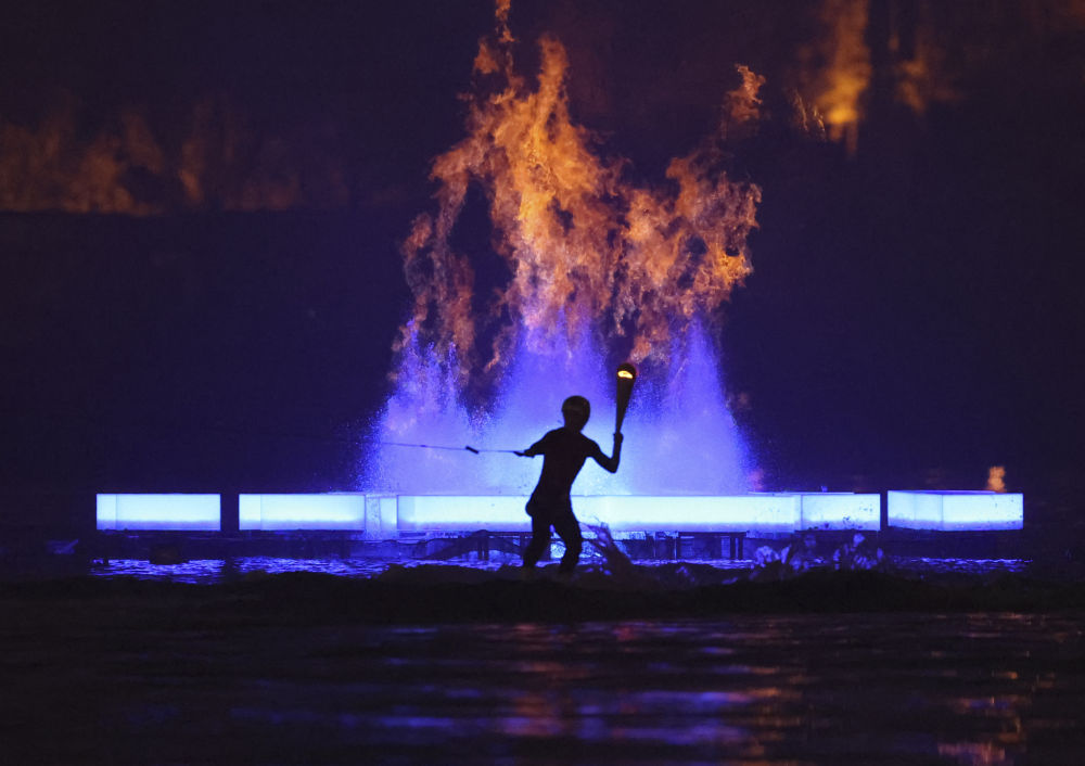 此次開幕式進行了世運會歷史上第一次主火炬點燃儀式,主創(chuàng)團隊經(jīng)過多輪研討,采取火在噴泉中燃燒作為主要創(chuàng)意點,通過精心設(shè)計,讓天然氣向上穿過水柱,實現(xiàn)節(jié)能燃燒。