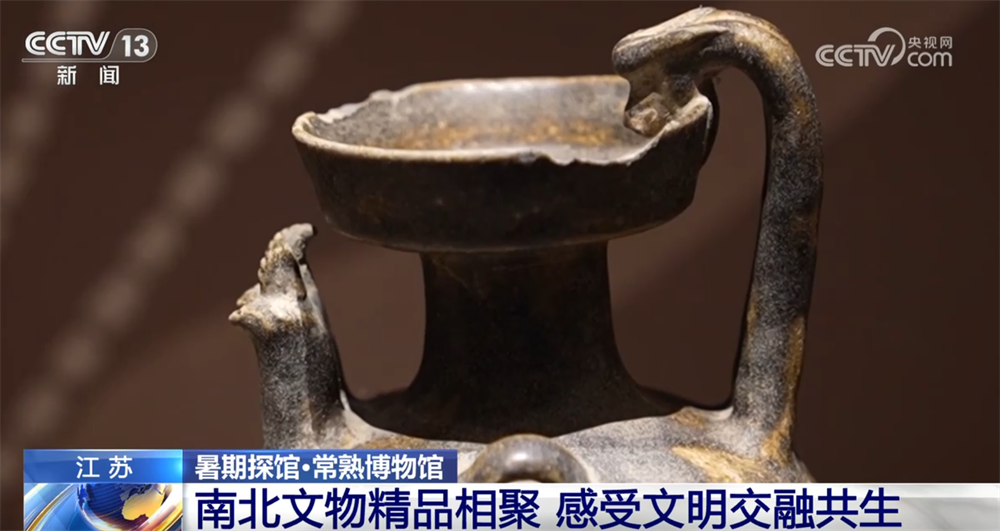 再來看這一件展品,這是東晉時期浙江德清出土的雞首壺,一側是有一個雞頭模樣的造型,一個巴掌大小,矮胖矮胖的。再到這邊來看,同樣是雞首壺,從南方地區(qū)傳到北方去之后,它的造型也發(fā)生了一些變化,比如說它的個頭變得更加瘦高瘦高的,而且它的執(zhí)柄也明顯變得更加修長,它也融入了一些異域的比如說波斯文化的元素。