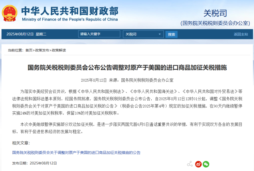為落實(shí)中美經(jīng)貿(mào)會(huì)談共識(shí),根據(jù)《中華人民共和國關(guān)稅法》、《中華人民共和國海關(guān)法》、《中華人民共和國對(duì)外貿(mào)易法》等法律法規(guī)和國際法基本原則,經(jīng)國務(wù)院批準(zhǔn),國務(wù)院關(guān)稅稅則委員會(huì)公布公告,自2025年8月12日12時(shí)01分起,調(diào)整《國務(wù)院關(guān)稅稅則委員會(huì)關(guān)于對(duì)原產(chǎn)于美國的進(jìn)口商品加征關(guān)稅的公告》(稅委會(huì)公告2025年第4號(hào))規(guī)定的加征關(guān)稅措施,在90天內(nèi)繼續(xù)暫停實(shí)施24%的對(duì)美加征關(guān)稅稅率,保留10%的對(duì)美加征關(guān)稅稅率。