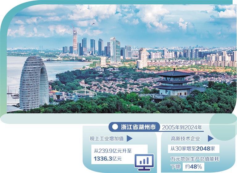 數(shù)據(jù)顯示,2005年到2024年,湖州規(guī)上工業(yè)增加值從239.9億元升至1336.3億元,高新技術(shù)企業(yè)從30家增至2048家,萬(wàn)元地區(qū)生產(chǎn)總值能耗下降約48%。
