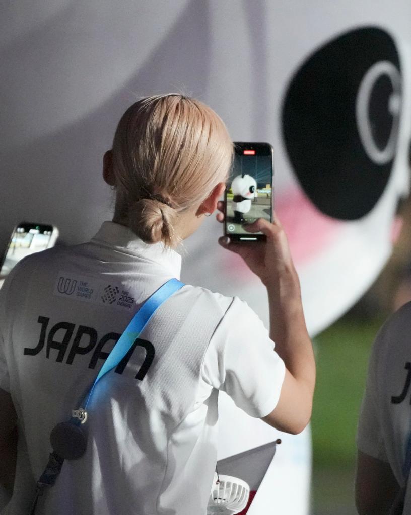 2025年8月7日,一名日本體育代表團(tuán)成員在開幕式上拍攝吉祥物“蜀寶”。當(dāng)日,第12屆世界運(yùn)動(dòng)會(huì)開幕式在成都舉行。新華社記者 胥冰潔 攝