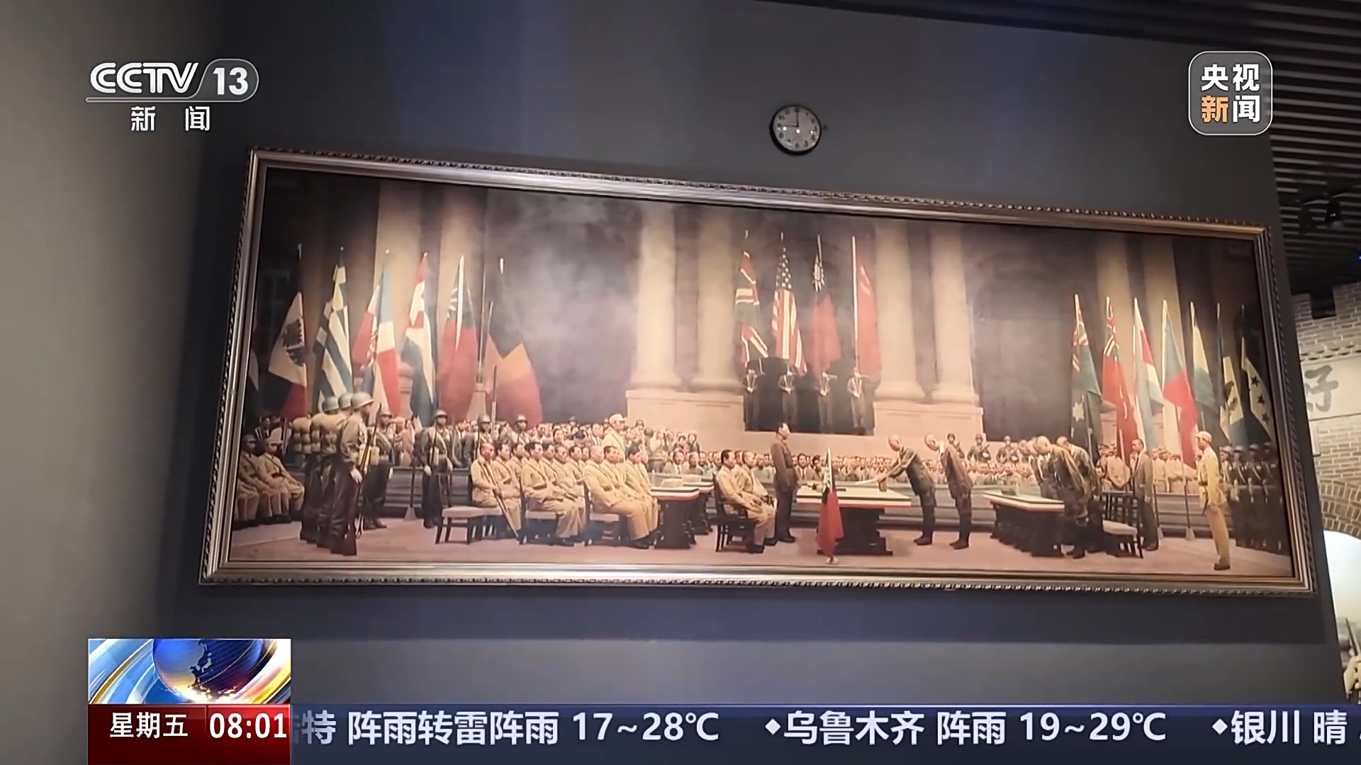 中國人民抗日戰(zhàn)爭紀念館展覽陳列部副主任 韓小昆:左側(cè)畫面有個角落,有一把空白的椅子是沒有畫人物的。整個作品形象里面有200多個人,但唯獨空了一把椅子。這是基于歷史進行的藝術創(chuàng)作,就是說,在戰(zhàn)爭中犧牲的英烈們也參加了這個受降儀式。