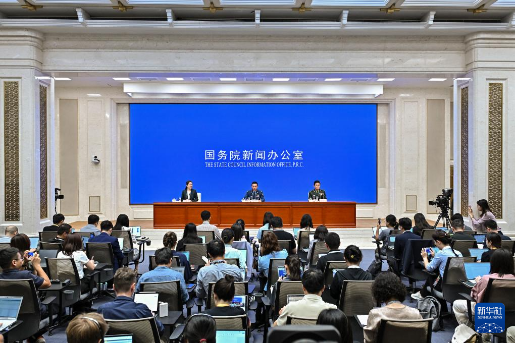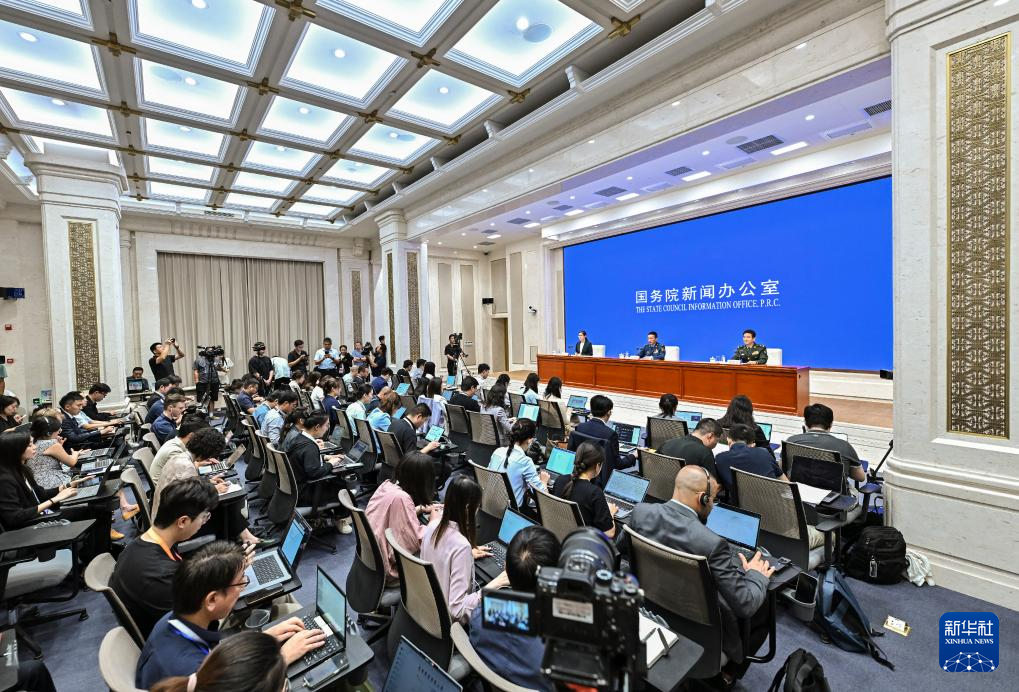 8月20日,國務(wù)院新聞辦公室在北京舉行新聞發(fā)布會,閱兵領(lǐng)導(dǎo)小組辦公室副主任、中央軍委聯(lián)合參謀部作戰(zhàn)局少將副局長吳澤棵,中國人民解放軍中部戰(zhàn)區(qū)閱兵指揮機(jī)構(gòu)辦公室常務(wù)副主任、政治工作部少將副主任徐貴忠介紹閱兵準(zhǔn)備工作有關(guān)情況,并答記者問。新華社記者 李鑫 攝
