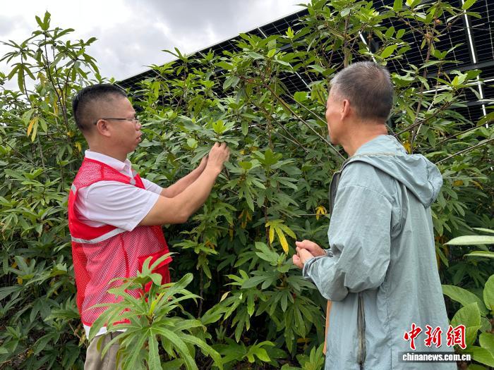 烈日下,光伏板下溫潤小氣候讓五指毛桃長得格外舒展。陽光被“折疊”利用,荒坡石礫地成了寶地。