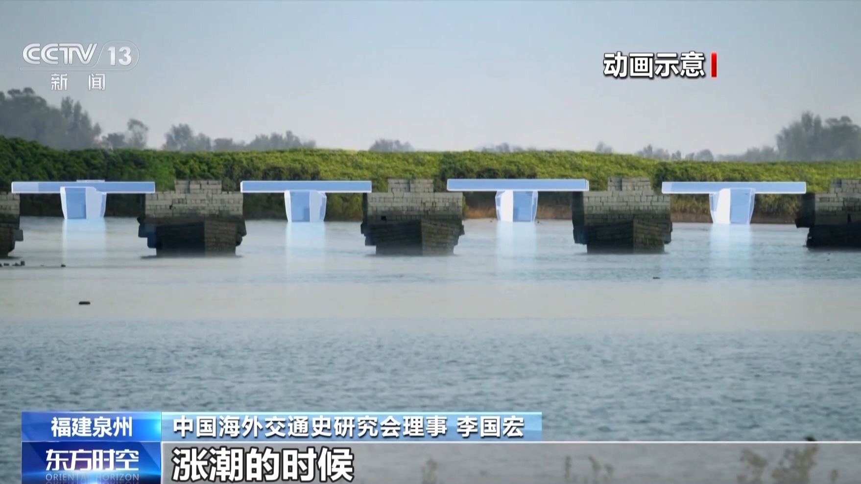 中國海外交通史研究會理事 李國宏:這就是洛陽橋在建造的時候運用的浮運架梁法,漲潮的時候先把巨大的石板安放在船上,慢慢駛向兩個橋墩之中,落潮了,巨大的石板就穩(wěn)定地安放在橋墩上,船也趁著落潮安全的駛離橋墩。