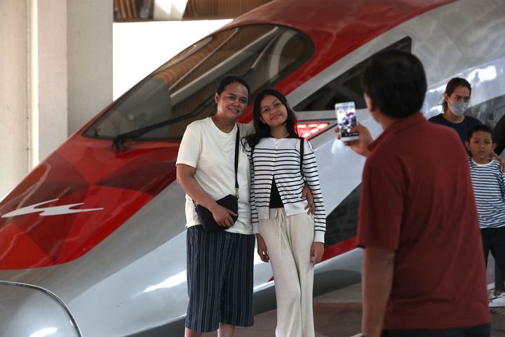 6月19日,在印度尼西亞雅加達(dá)哈利姆站站臺(tái),兩名乘客與雅萬高鐵高速動(dòng)車組列車合影。 新華社記者 岑云鵬 攝
