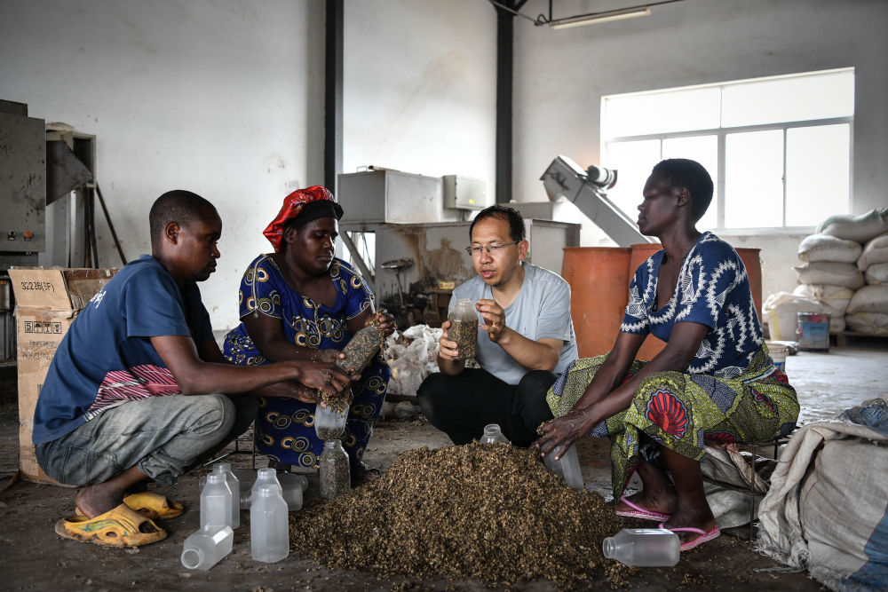 2024年8月13日,在盧旺達(dá)南方省胡耶區(qū)的中國(guó)援盧農(nóng)業(yè)技術(shù)示范中心,菌草專家陳曉斌(右二)與當(dāng)?shù)剞r(nóng)民一起制作菌種培養(yǎng)料。新華社記者 韓旭 攝