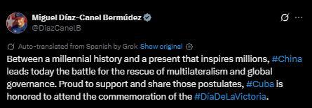 報道稱,迪亞斯-卡內(nèi)爾在社交媒體上贊揚中國政府和軍隊,并對中方作為東道主的熱情款待表示感謝。
