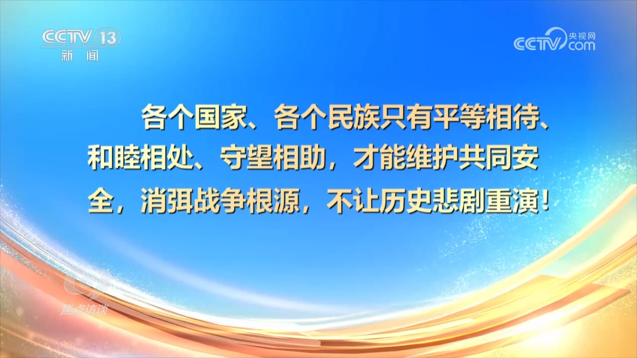 央視網(wǎng)消息(焦點(diǎn)訪談):9月3日上午,紀(jì)念中國人民抗日戰(zhàn)爭(zhēng)暨世界反法西斯戰(zhàn)爭(zhēng)勝利80周年大會(huì)在北京隆重舉行。我們以盛大閱兵儀式,同世界人民一道紀(jì)念這個(gè)偉大的日子。同日,紀(jì)念中國人民抗日戰(zhàn)爭(zhēng)暨世界反法西斯戰(zhàn)爭(zhēng)勝利80周年招待會(huì)在人民大會(huì)堂隆重舉行。在這些紀(jì)念活動(dòng)中,習(xí)近平總書記發(fā)表一系列重要講話,強(qiáng)調(diào)要銘記歷史、緬懷先烈、珍愛和平、開創(chuàng)未來。