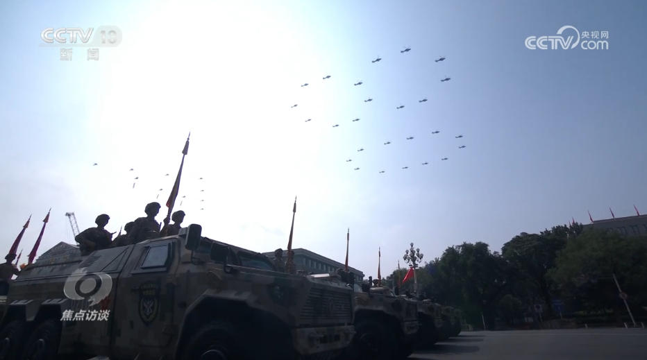 藍(lán)天之上,轟鳴聲持久不息,由26架直-19型武裝直升機(jī)組成的“80”字樣編隊(duì)向天安門飛來(lái),寓意紀(jì)念中國(guó)人民抗日戰(zhàn)爭(zhēng)暨世界反法西斯戰(zhàn)爭(zhēng)勝利80周年。