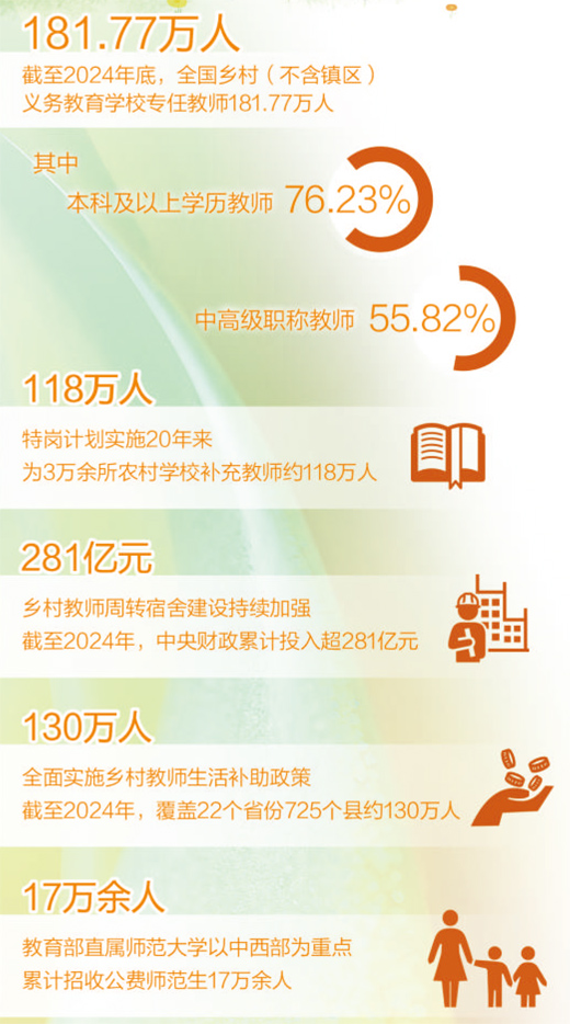 這是真金白銀的投入。2024年,特崗教師工資性補助再次提標,每人每年增加3600元;鄉(xiāng)村教師生活補助政策深入實施,受益教師約130萬人,人均月補助金額約400元;鄉(xiāng)村教師周轉宿舍建設持續(xù)加強,中央財政累計投入超281億元,建設約63.7萬套。
