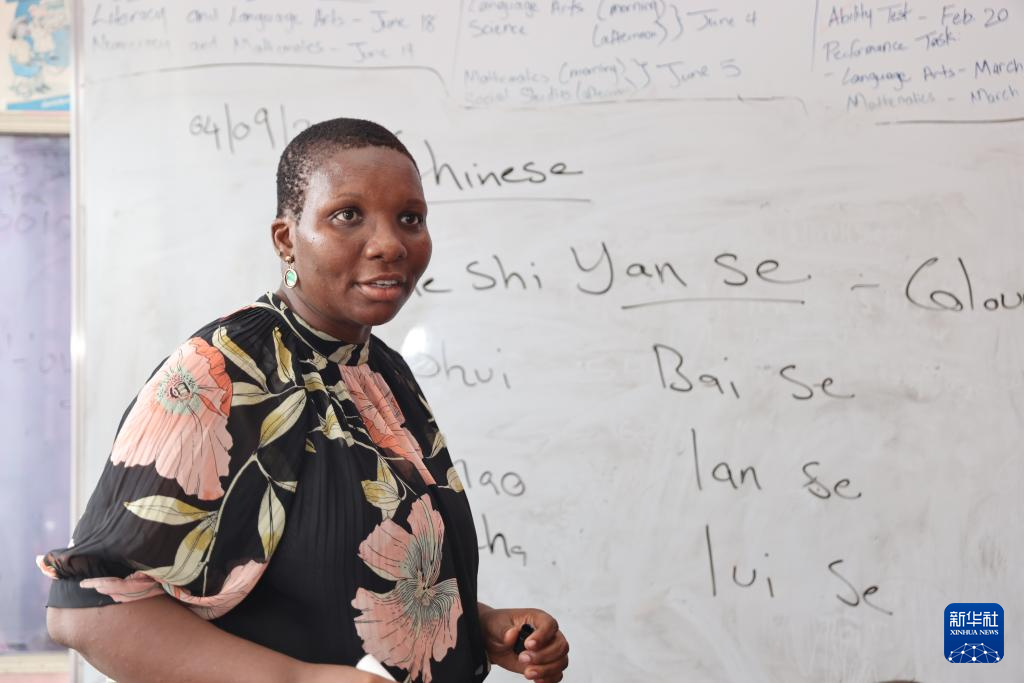 在牙買加首都金斯敦的一間教室里,艾特特殊教育小學(xué)校長(zhǎng)娜塔莎·拉塞爾在黑板上書寫著與顏色相關(guān)的漢字,孩子們端坐在椅子上,跟隨她輕聲朗讀。教室里時(shí)而響起整齊的讀書聲,時(shí)而響起輕快的中文歌曲旋律。
