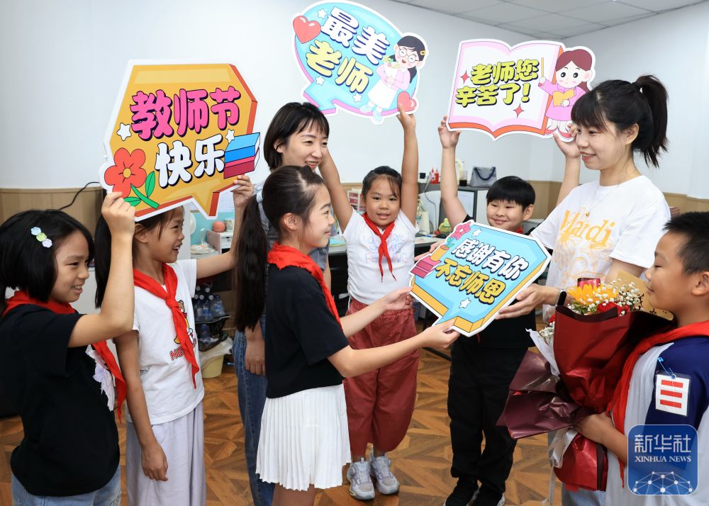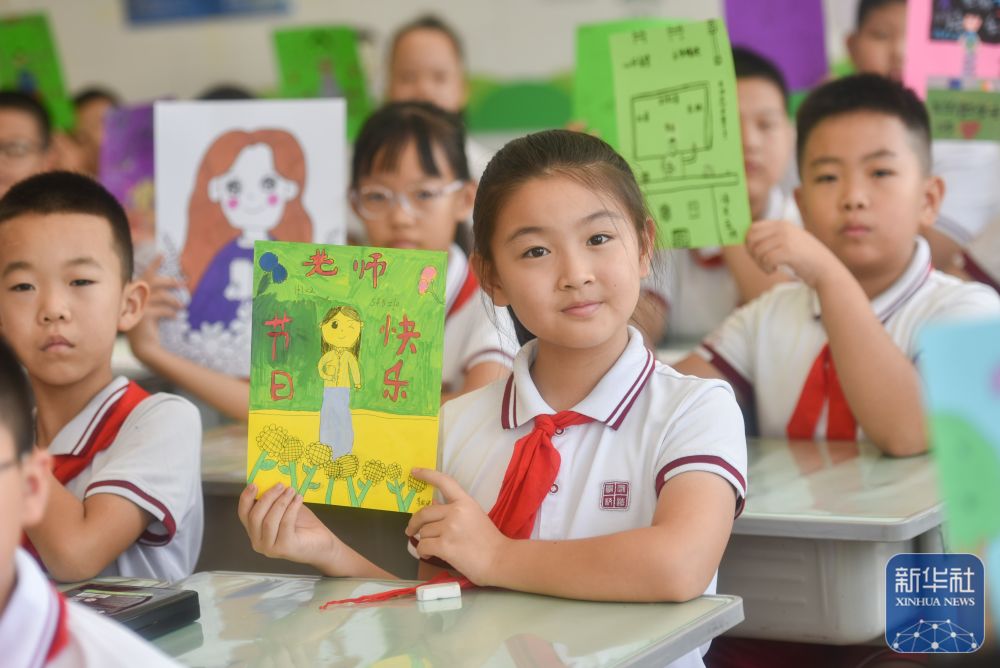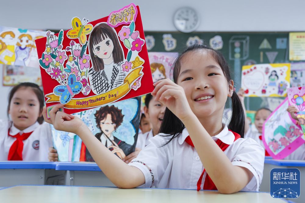 9月9日,在武漢市未來(lái)實(shí)驗(yàn)小學(xué)美林校區(qū),學(xué)生為教師送上節(jié)日祝福。新華社發(fā)(趙軍攝)