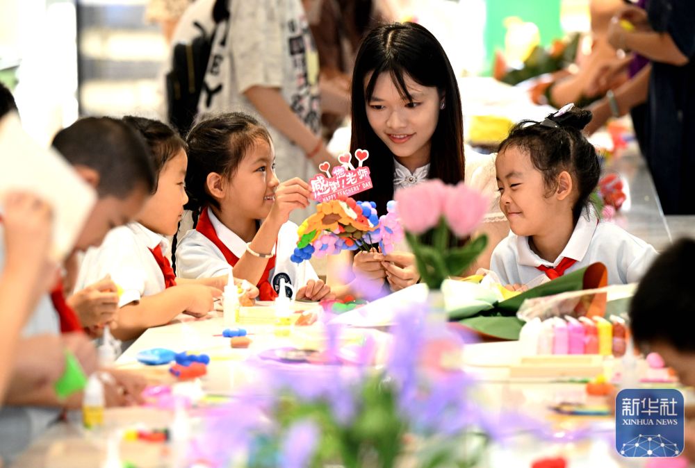 9月9日,在河北省石家莊市柏林莊學(xué)校開(kāi)展的“黏土做花寄師恩”主題活動(dòng)中,孩子們用粘土制作花束,為老師送上節(jié)日的祝福。新華社發(fā)(陳其保攝)