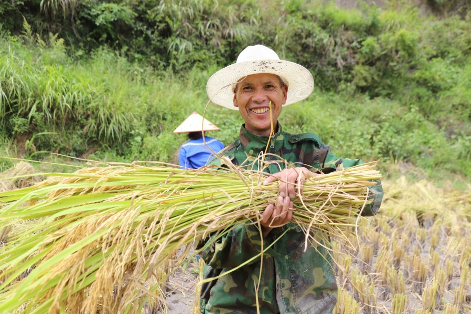貴州省黔東南州鎮(zhèn)遠縣報京鄉(xiāng)的農(nóng)戶展示稻穗,臉上洋溢著笑容(央廣網(wǎng)發(fā) 張佳怡 攝)