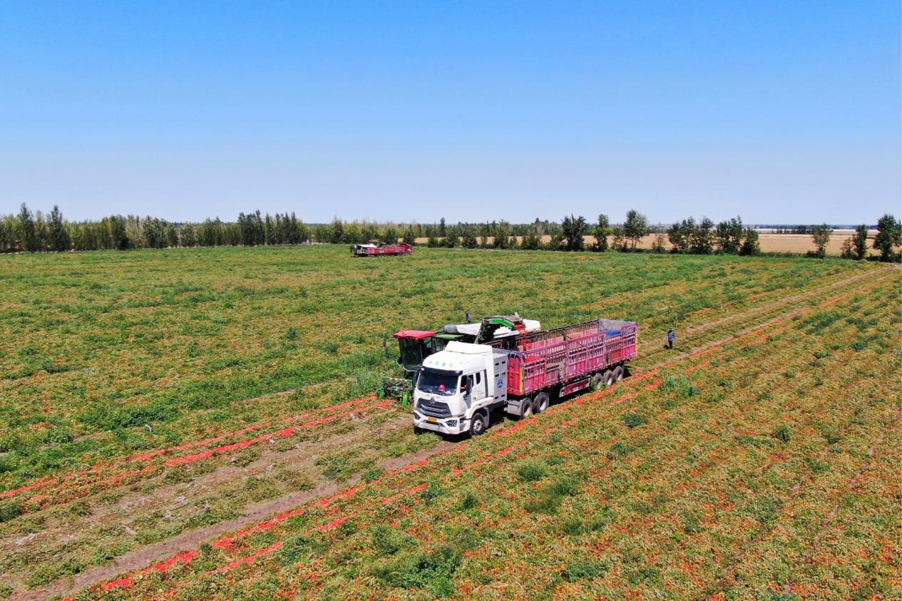 吉木薩爾縣三臺鎮(zhèn)的1200余畝加工番茄迎來了豐收季。在羊圈臺子村,種植戶俞瑞海家的300畝番茄地里,現(xiàn)代化采收機械正來回穿梭。