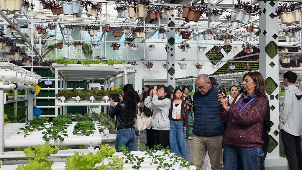 走進昌吉新疆農(nóng)業(yè)博覽園內(nèi)的垂直農(nóng)業(yè)展示區(qū)、葉菜工廠示范區(qū)和果菜工廠示范區(qū),目睹無土栽培、無人機灌溉、光合作用智能調(diào)控等一系列農(nóng)業(yè)高科技應(yīng)用為作物“量身定制”生長環(huán)境,參訪議員們紛紛拍照記錄。