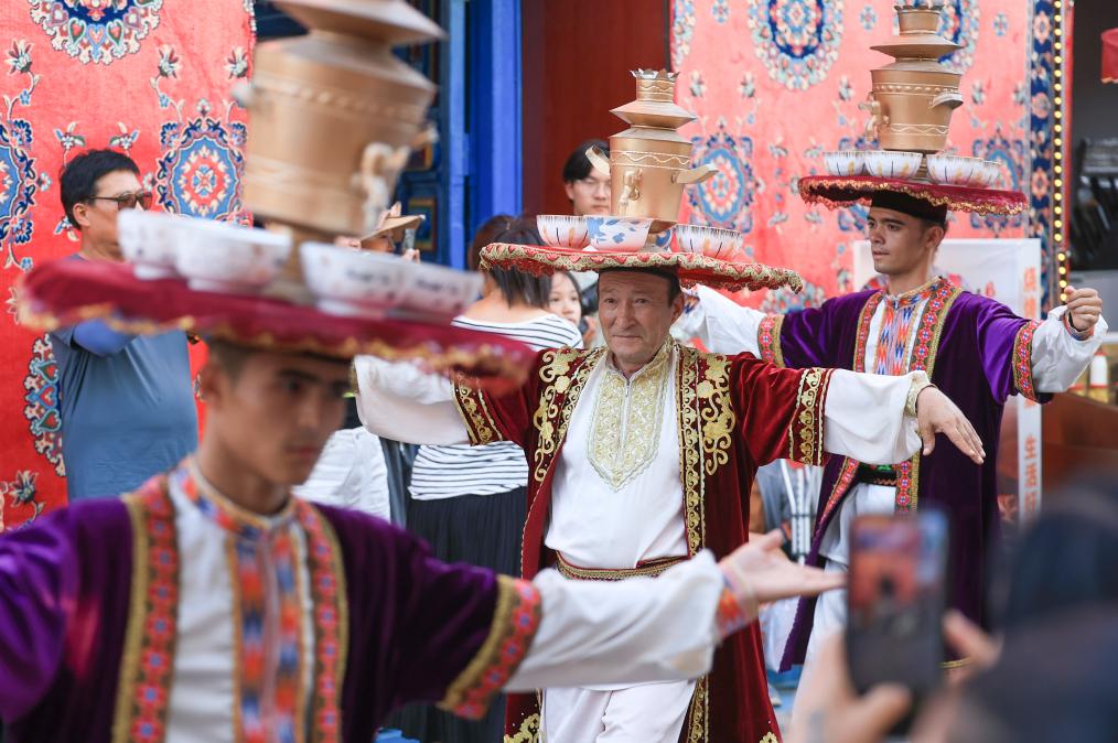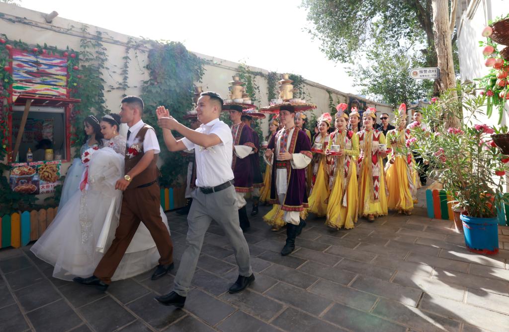 7月22日,在新疆庫(kù)車(chē)市的龜茲小巷,表演薩瑪瓦爾舞的演員參與當(dāng)?shù)氐囊粓?chǎng)婚禮活動(dòng)。新華社記者 王菲 攝