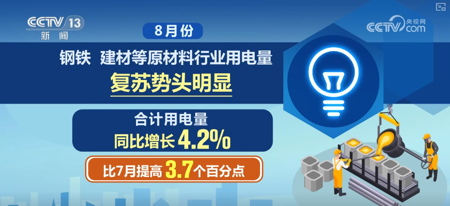 除了制造業(yè),8月份,鋼鐵、建材等原材料行業(yè)用電量復(fù)蘇勢頭明顯,合計用電量同比增長4.2%,比7月提高3.7個百分點。